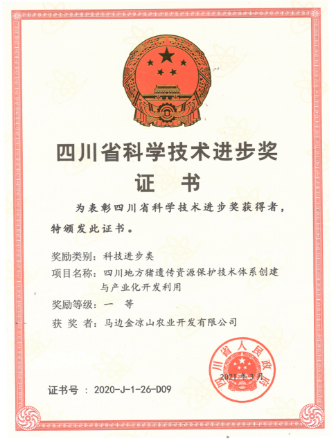 马边金凉山在县委县政府支持下,在各级农业农村部门的指导下,从2010年开始乌金猪(凉山猪)的保种和开发利用工作。经过十年不懈努力,于2021年3月获得四川地区猪遗传资源保护技术体系创建与产业化开发利用科学进步一等奖。目前,公司核心保种群共有乌金猪(凉山猪)能繁种母猪140头,种公猪18头的,存栏各类乌金猪1200头。