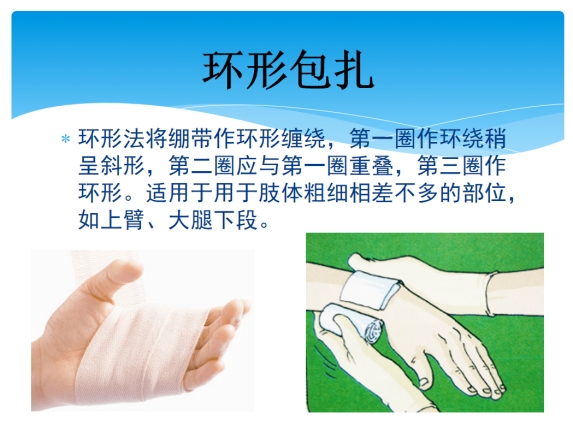 将绷带作环形重叠缠绕。第一圈环绕稍作斜状;第二、三圈作环形,并将第一圈之斜出一角压于环形圈内,最后用胶布将带尾固定,也可将带尾剪成两个头,然后打结。