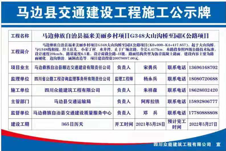 现将马边彝族自治县福来美丽乡村项目G348大山沟桥至园区公路项目公示牌公示如下: