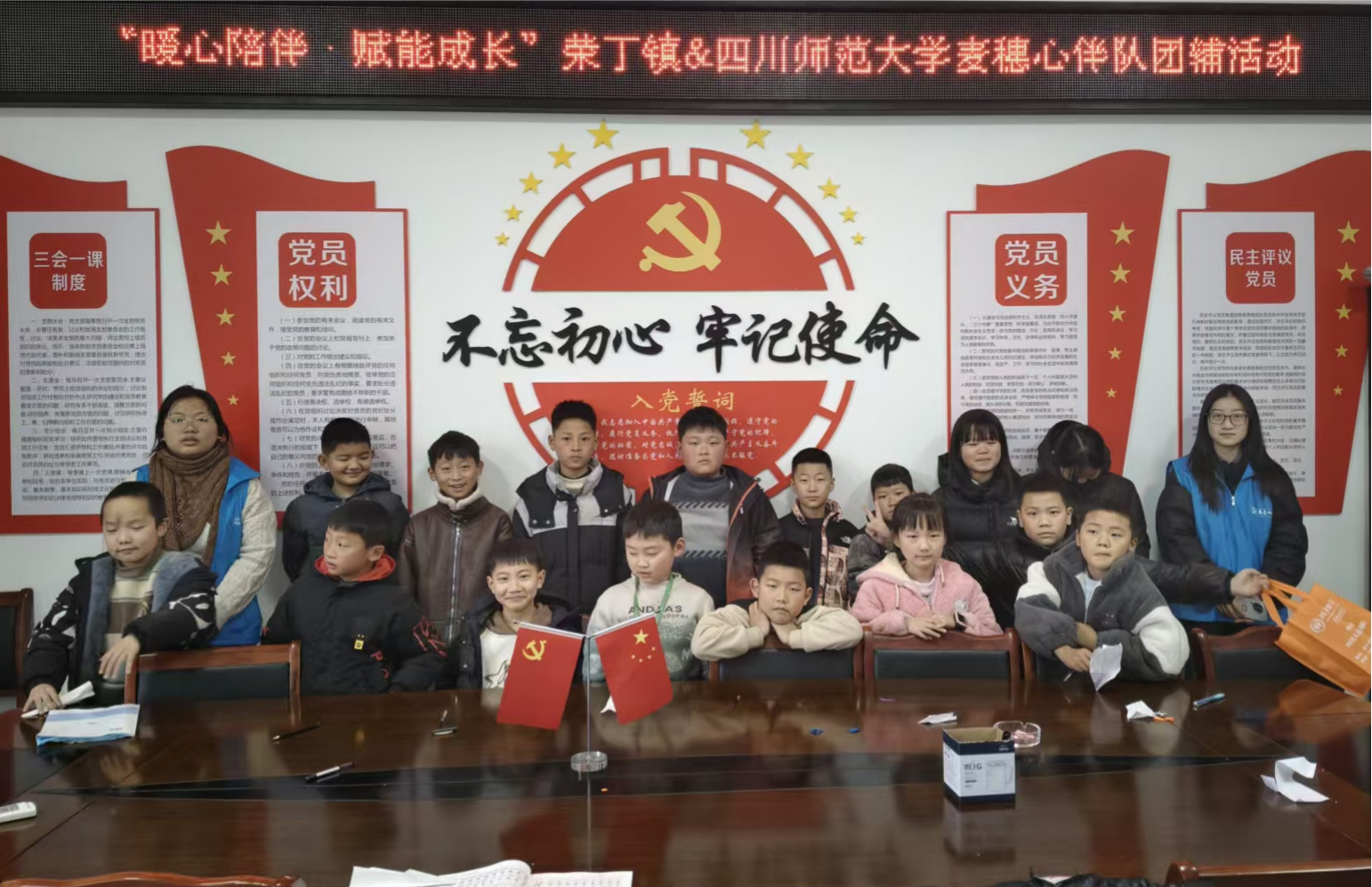 近日,一支由10名大学生志愿者组成的川师大“麦穗心伴队”,利用寒假时间走进荣丁镇,联合荣丁镇关工委开展了为期4天的寒假陪伴活动。志愿者们以实际行动践行志愿服务精神,为当地儿童带去知识、陪伴与温暖,赢得了群众广泛赞誉。