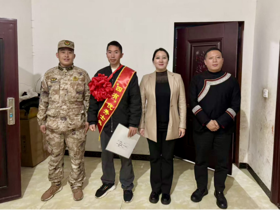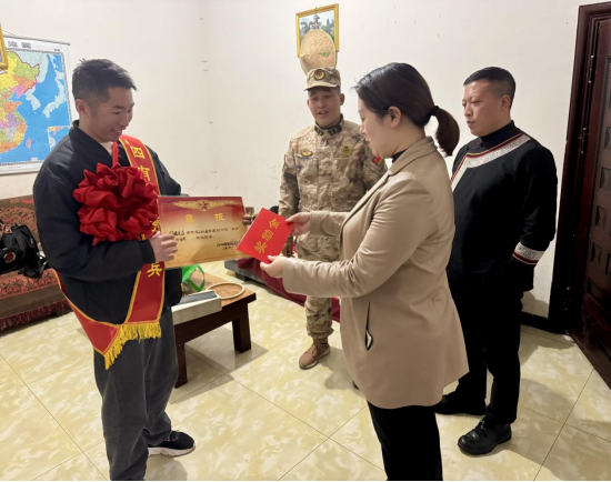 一纸喜报,承载军人荣光;一份关怀,传递鱼水深情。为深入贯彻落实拥军优属政策,厚植崇军尚武的社会风尚,切实增强现役军人及家属的荣誉感、幸福感和归属感,2026年3月12日,高卓营乡党委书记、武装教导员彭雪斌,乡长耍日三尔及乡武装干事组成慰问组,带着党和政府的温暖,专程奔赴优秀现役军人家中,开展立功喜报送达暨慰问活动,将部队的褒奖与家乡的惦念送到军属心坎上。