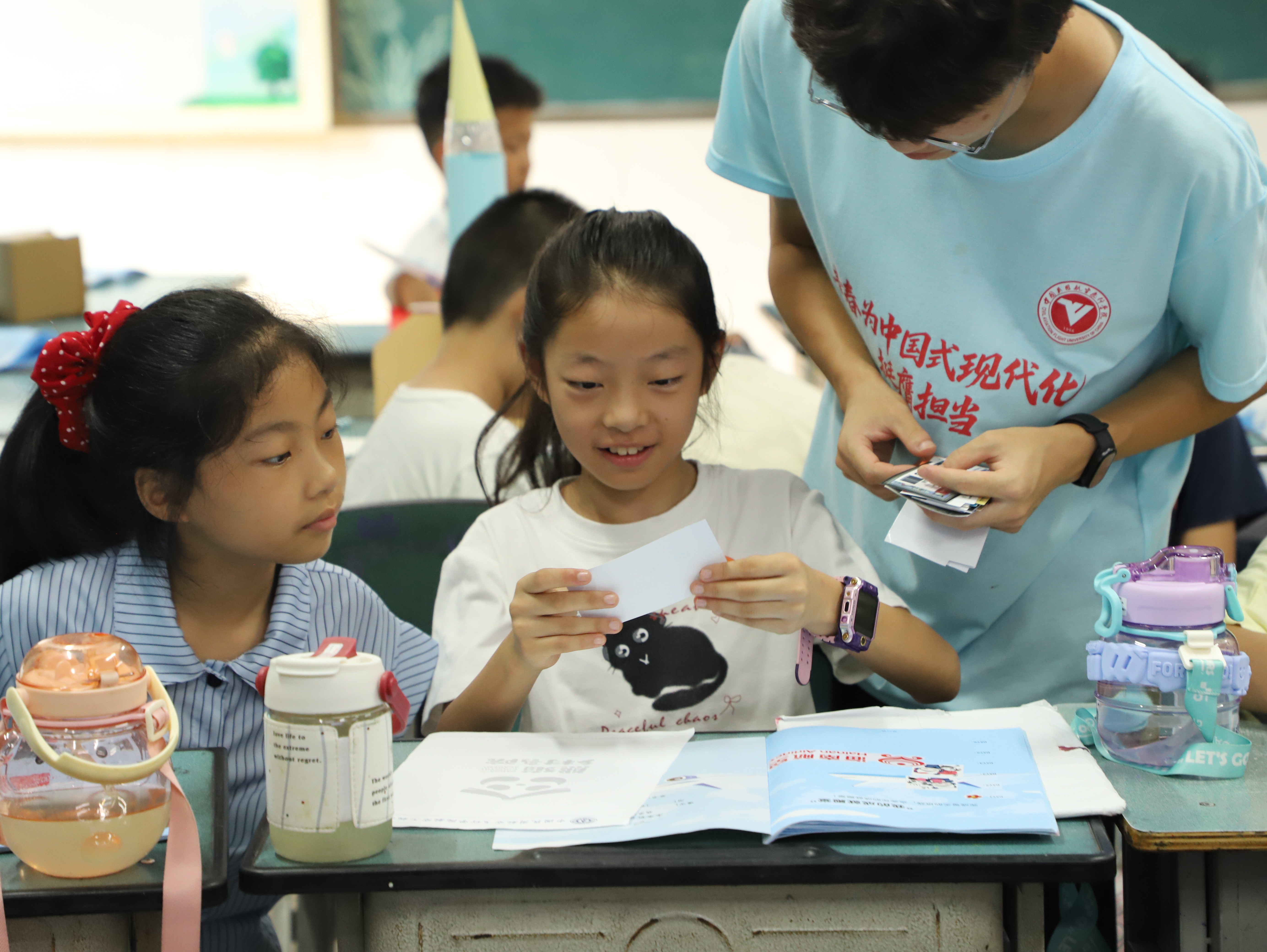 结营仪式上,志愿者为学员佩戴结业勋章,并为学员的研学手册盖满旅程印记。孩子们手册上的每一个字、每一张贴纸都记录着飞机原理课、星空观测夜的成长足迹。