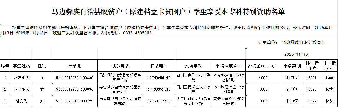 马边彝族自治县脱贫户(原建档立卡贫困户)学生享受本专科特别资助名单