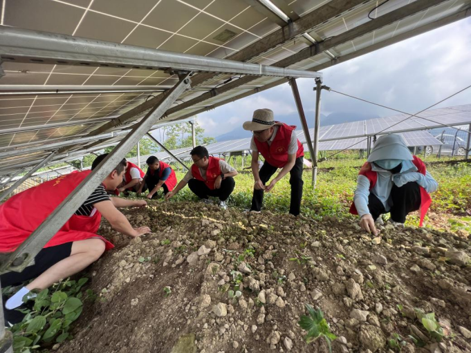 永红乡党委组织各党支部党员、志愿者到团包子村光伏发电站开展“我为群众办实事”主题党日活动,为前期种植的竹荪田清理杂草、浇水施肥,以实际行动助力集体经济增收,让老百姓钱包鼓起来。