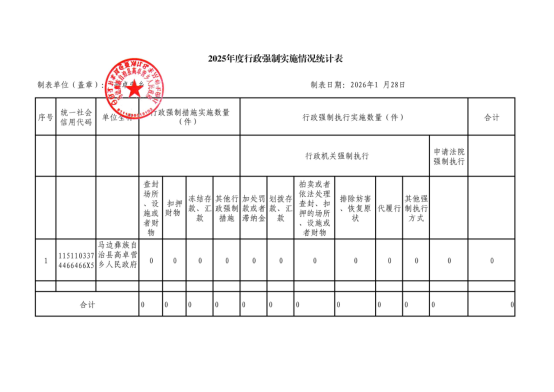 高卓营乡行政许可、行政处罚、行政强制实施情况公示表(2025年)